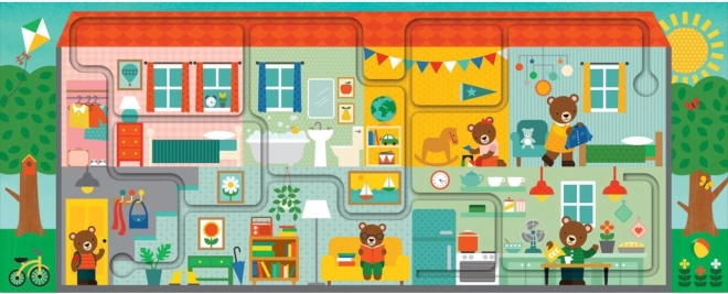 Fedezd fel az okos gyerekpuzzlet labirintussal, amely fejleszti a finommotorikát, a figyelmet és az észlelést. A 10 nagy darab összeillesztése után a gyerekek ujjukkal végighaladnak az ösvényen, és megkeresnek 20 tárgyat a színes mackóházikóban. Újrahasznosított papírból készült, növényi alapú festékekkel nyomtatva, és megfelel a biztonsági előírásoknak. Ideális 2 éves kortól.