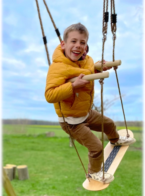A robusztus fa fogantyúk a köteleken könnyen a megfelelő magasságba állíthatók. Támaszt nyújtanak fel- és leszálláskor, valamint állva hintázás közben.