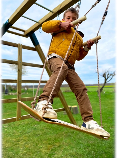 Ez a rendhagyó hinta ötvözi a szórakozást és a mozgásfejlesztést. A hajlított szélű, masszív rétegelt lemezből készült deszka és az állítható, tömörfa fogantyúk lehetővé teszik, hogy a gyerekek biztonságosan fejlesszék egyensúlyukat, koordinációjukat és stabilitásukat. A csúszásgátló felületnek köszönhetően az állva hintázás még biztosabb és kényelmesebb.