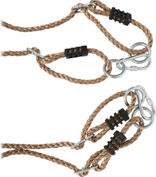 A nejlon kötelek fém átvezetőkkel, gyűrűkkel és biztonsági karabinerekkel gyors, erős és biztonságos felakasztást biztosítanak.