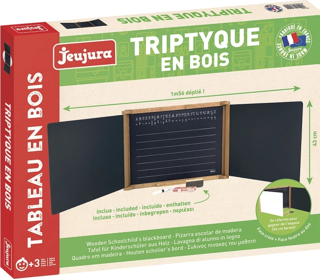 Stílusos, falra szerelhető, háromszárnyú, tömör fából készült tábla, amely teret ad a kreativitásnak és a tanulásnak gyermekeknek és felnőtteknek egyaránt. Ötvözi a krétához való fekete felületet és a filctollhoz való fehér felületet, rendelkezik vonalazott középső résszel írásmintákkal az egyszerű gyakorláshoz, mágneses funkcióval és praktikus tárolópolccal. A csomag tartalmaz krétákat, filctollat és szivacsot. Franciaországban készült minőségi bükk- és fenyőfából, vízbázisú festékekkel és lakokkal kezelve.