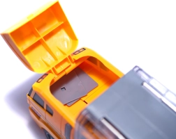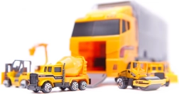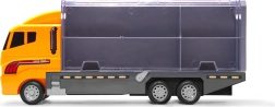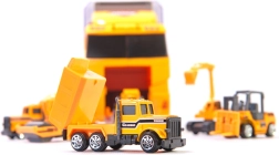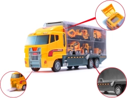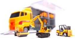 Nagy szett kis építőknek: masszív vontató átlátszó fedéllel, amely 6 mini építőgép (markoló, rakodó, betonkeverő stb.) számára szolgál rendszerezőként és szállítóként. A nyitható motorháztetőnek és a kioldható rámpának köszönhetően az autók egy gombnyomásra könnyedén kigördülnek. A játék tartós ABS műanyagból készült, élethű részletekkel és könnyű hordozhatósággal – ideális otthonra, utazáshoz és óvodába is.