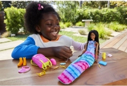 A BARBIE „It Takes Two” sorozat által ihletett szett valósághű kiegészítőket és részletgazdag megoldásokat kínál, amelyek támogatják a kreatív történetmesélést. A baba modern, természetbe illő öltözéket visel – csíkos pólót, „farmer” kantáros nadrágot és sárga cipőt –, és készen áll a kalandra kiskutyájával.