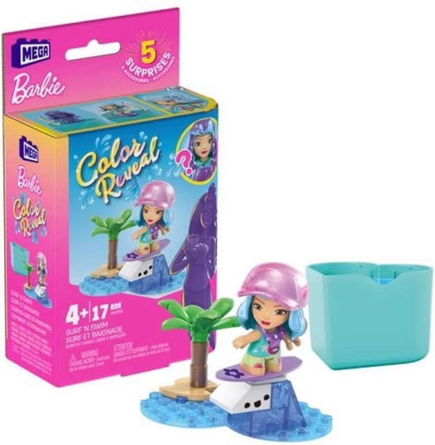 A Mega Construx Barbie Color Reveal készlet egyedi élményt nyújt, tele meglepetéssel, amely egy szív alakú csomagolás kinyitásával kezdődik. Belül két zacskót talál, amelyek tartalmazzák: