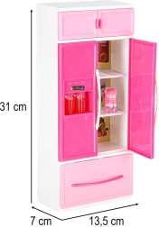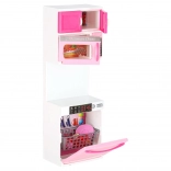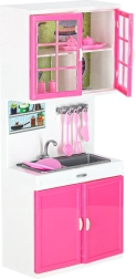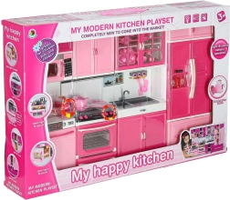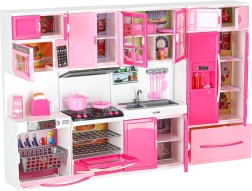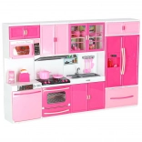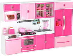 A készlet tartalmaz mikrohullámú sütőt és mosogatógépet, tűzhelyet sütővel, vitrint mosogatóval, valamint fiókos hűtőt. A gyerekek teljes főzés-, sütés- és takarítási jeleneteket játszhatnak el.