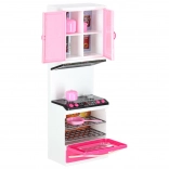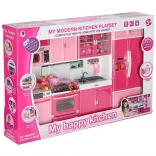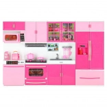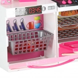Stílusos rózsaszín-fehér babakonyha négy modulból, LED-megvilágítású égőkkel és hangeffektekkel. Nyitható ajtók, mikrohullámú sütő, sütő, mosogatógép, hűtő és mosogató, valamint gazdag tartozékkészlet a realista főzős szerepjátékhoz és a konyha rendszerezéséhez.