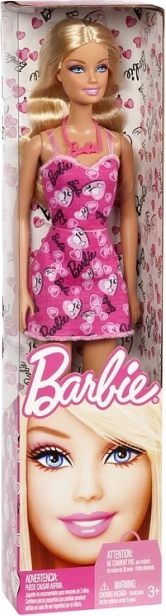 A Barbie baba stílusos rózsaszín dobozban van csomagolva, látható 'Barbie' márkajelzéssel, 3 éves kortól gyerekek számára alkalmas. Tökéletes a képzelőerőt fejlesztő játékokhoz.