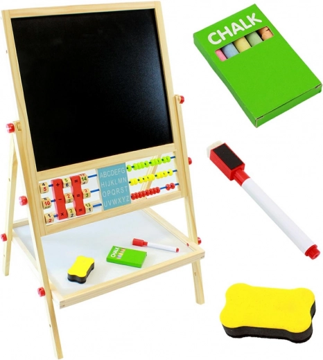 Ez a kétszemélyes oktatótábla ideális kreatív és tanuló gyermekek számára. **Kétoldalas kialakítás** lehetővé teszi, hogy a gyerekek krétával rajzoljanak a fekete oldalon, illetve filctollal a fehér oldalon. A tábla tartalmaz egy **klasszikus számológyöngyöt**, amely segíti az alapvető matematikai műveletek, például összeadás, kivonás és szorzás elsajátítását. Az óra segítségével a gyerekek megtanulhatják az idő felismerését és beállítását. Az **ABC betűk** szintén megtalálhatók a táblán, így a kicsik megismerhetik az első betűiket.