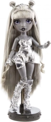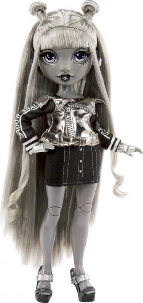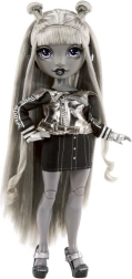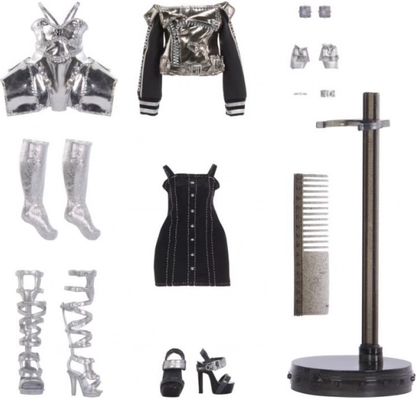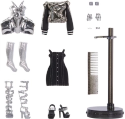 A csomag része egy stílusos öltözék szürke, fekete és ezüst árnyalatokban, kiegészítve cipőkkel, ékszerekkel és állvánnyal. A gazdag kiegészítőcsomag támogatja az ötletes játékot, a stílusok keverését és a gyűjtői kiállítást. Lépjen be a RAINBOW HIGH és a SHADOW HIGH iskolák rivalizálásába, és alkosson saját divatforgatókönyveket.