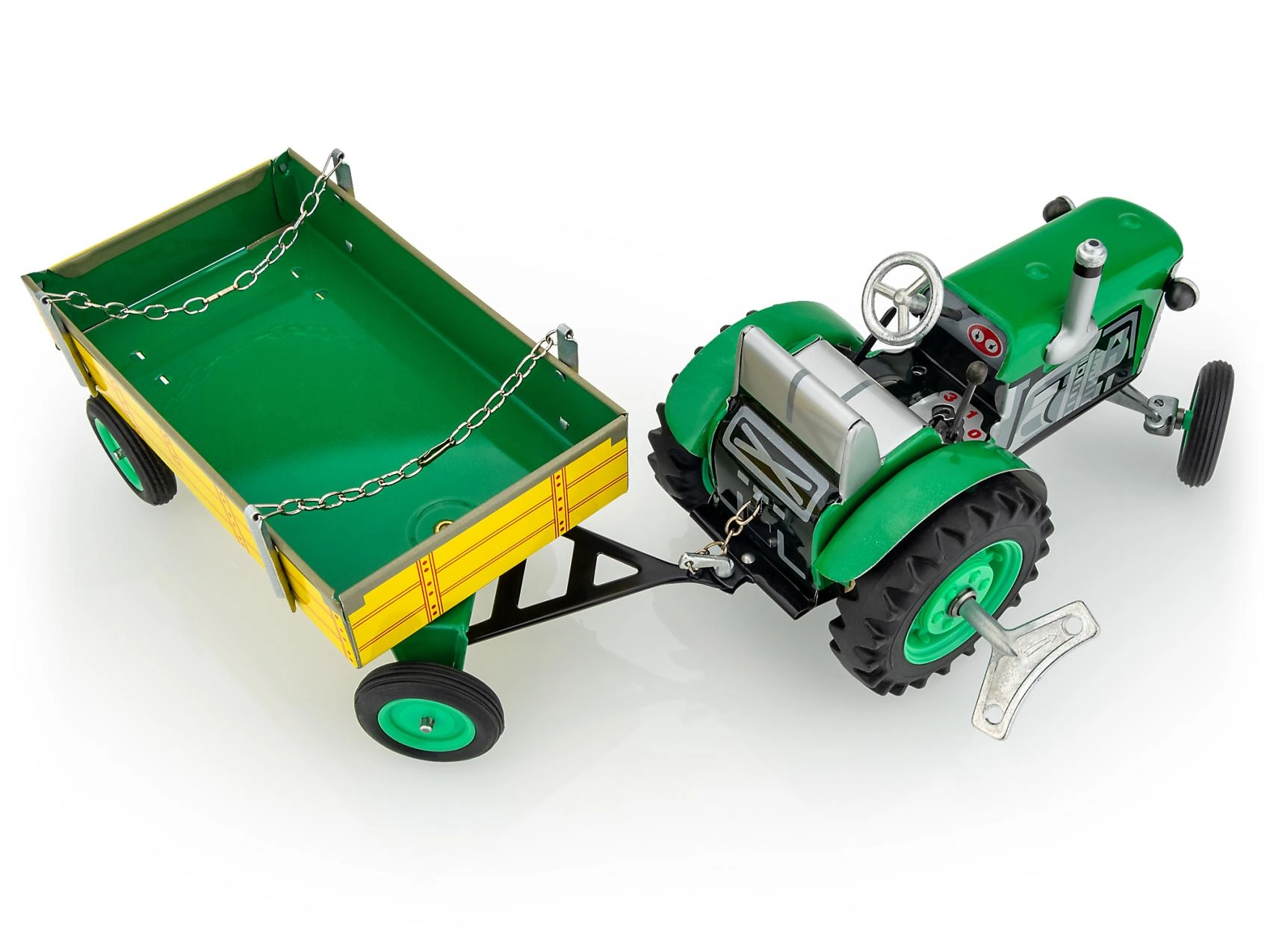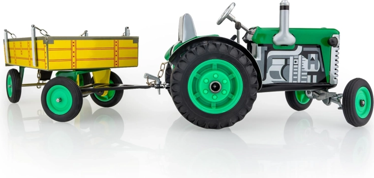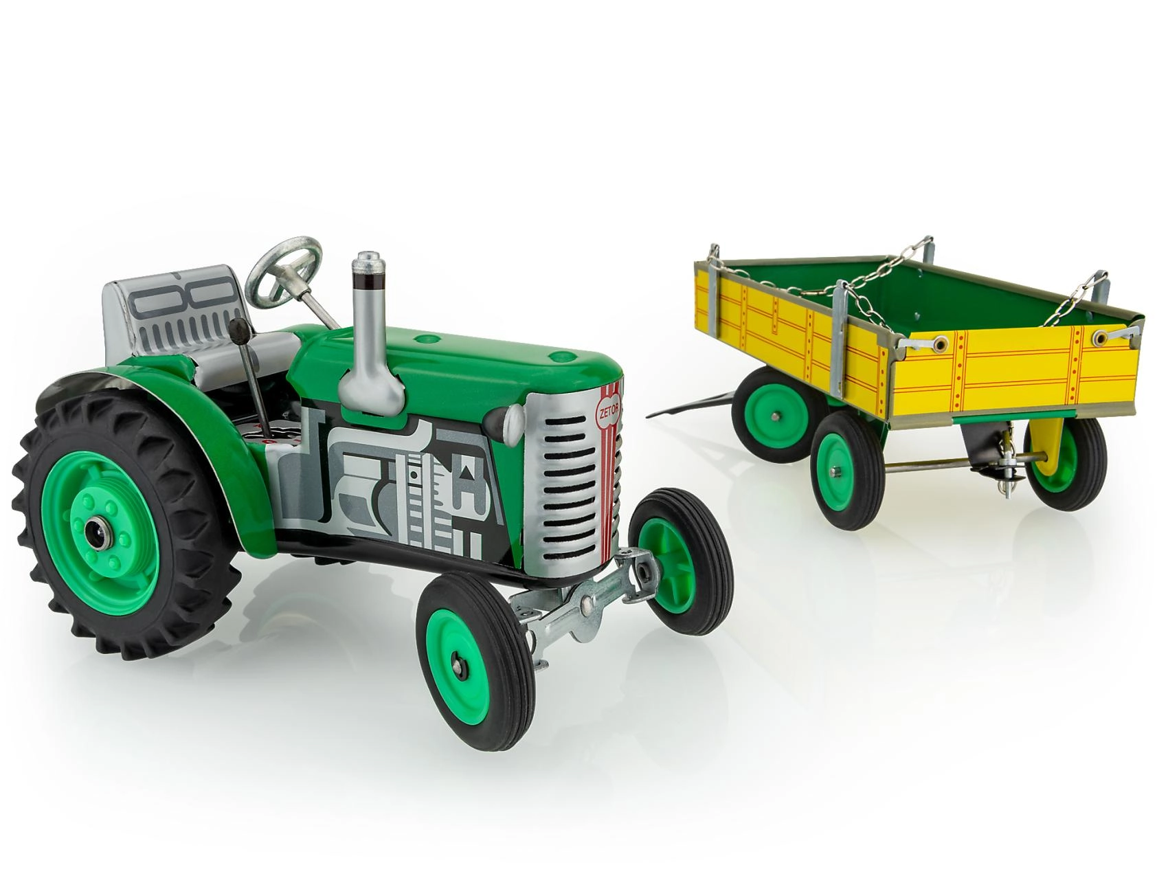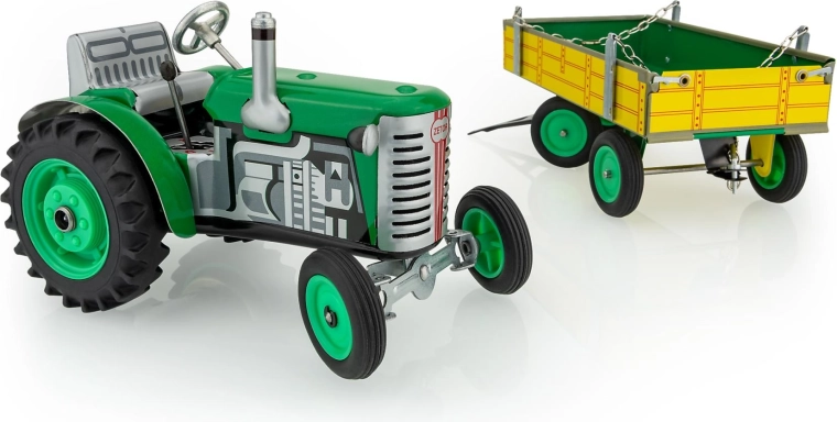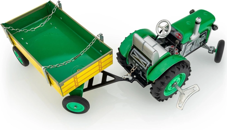 A KOVAP márkájú, fém Zetor traktor billenőplatós pótkocsival a mezőgazdasági gépek kis és nagy rajongóinak egyaránt örömet szerez. Meghajtását felhúzós rúgós szerkezet biztosítja, rendelkezik működő sebességváltóval 3 előremeneti fokozattal és hátramenettel, kormánykerékkel történő irányítással és kézifékkel. 1:25-ös méretarányban és 28 cm-es hosszal autentikus vezetési élményt és gyűjtői értéket kínál.