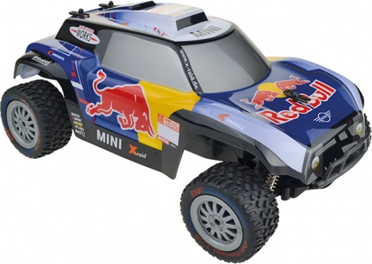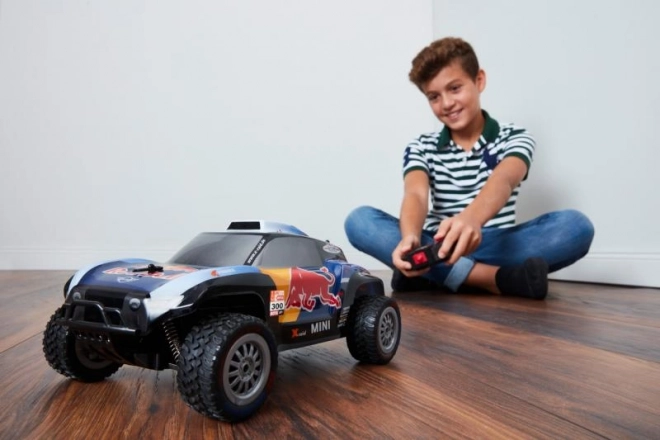 Kétcsatornás, távirányítós autómodell X-Raid MINI JCW Buggy Red Bull 1:16, 2,4 GHz frekvencián. Egyszerre akár 10 versenyzővel is működhet. Méret: 30,5 × 11,5 × 17 cm.