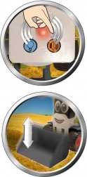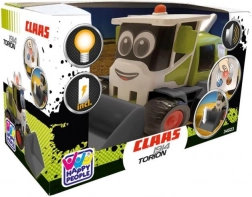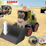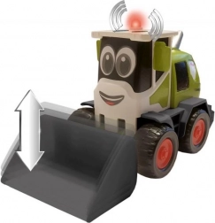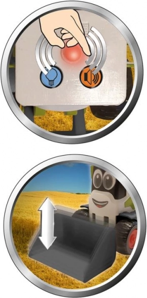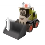 Ez a bájos, zöld színű CLAAS Mini rakodó fekete kerekekkel és piros részletekkel a legkisebbeket is lenyűgözi élethű funkcióival. Gombnyomásra motorhang hallatszik és felgyulladnak a figyelmeztető fények. A kézzel vezérelhető kanál megkönnyíti az emelést és süllyesztést, fejlesztve a finommotorikát.