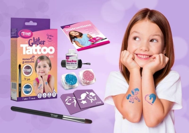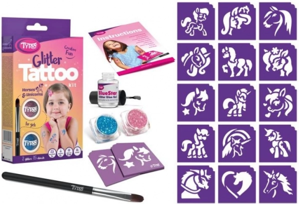 Élvezd a csillámtetoválások varázsát gyönyörű ló-, póni- és egyszarvú mintákkal a TyToo készletnek köszönhetően. Használd az egyedi mintákat, amelyek akár 18 napig is megmaradnak a bőrön, a bőrtípusodtól és az ápolástól függően. A nagyobb készletek mozgatható szemeket és öntapadós strasszokat tartalmaznak, amelyeket a bőrre rögzíthetsz, így alkotva igazán egyedi mintát.
