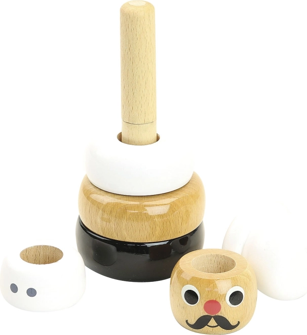 A fa elemek rúdra rakosgatása fejleszti a fogást, a mozgás pontosságát és a kéz–szem koordinációt – ideális 12 hónapos kortól.