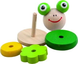 Hintázó piramis Békalos kitűnő fa játék a kisgyermekek motorikus képességeinek és képzeletének fejlesztésére. 4 felfűzhető részből és egy alap fa részből áll, amely rúdjával szórakoztatóan ugrál és forog.