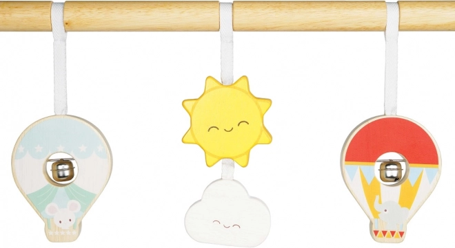 Interaktív függő játékok, mint a nap és a léggömbök, támogatják a gyermek érzékszervi és motoros fejlődését.