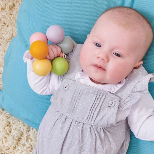 Pasztellszínű fa golyók rugalmas gumipánton – kellemes fogásúak, és segítenek megkönnyebbülést hozni az érzékeny ínynek fogzáskor.