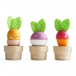 Ez az edukatív játék három virágcserépből és mosolygós zöldségekből áll, amelyek már 18 hónapos kortól elbűvölik a kis kertészeket. Minden elem a gyerekkezekhez igazodik, és különféle formák, textúrák és színek felfedezésére ösztönöz. Az építős elvnek köszönhetően a gyerekek gyakorolják a koncentrációt, a logikát és a koordinációt.