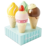 A Le Toy Van HONEYBAKE fa fagylaltkészlete bármely gyerekszobát kis fagyizóvá varázsol. Négy, különféle díszítésű gombóc természetes tölcsérben, kézzel festve, vízbázisú, környezetbarát festékekkel, ízléses állványon az áttekinthető kihelyezésért.