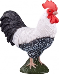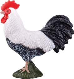 Hűen formázott tollazat, kontrasztos fekete-fehér színezés és piros taréj a kakas autentikus megjelenéséért.