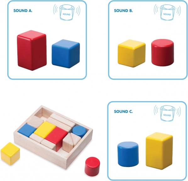 Ez a kompakt és precízen kidolgozott építőkészlet 6 színes csörgő kockát és 7 natúr kockát kombinál. A gyerekek a hang intenzitása és jellege szerint hasonlíthatják össze és párosíthatják az elemeket, miközben finommotorikájukat és logikus gondolkodásukat is fejlesztik. A doboz okos rendszerezőként szolgál, egyben kihívás is – a kockák visszahelyezése találékonyságot és térbeli képzelőerőt igényel.