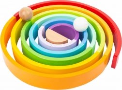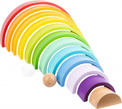 Ez a nagy fa szivárvány rengeteg játéklehetőséget kínál: tornyok és hidak építésétől a golyópályák készítésén át egészen az egyensúlyi kihívásokig. A gyerekek természetes módon tanulják a színeket, méreteket és a rendszerezést, fejlesztik a szem–kéz koordinációt és a logikus gondolkodást.