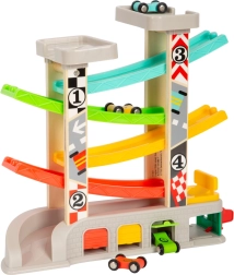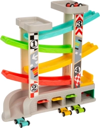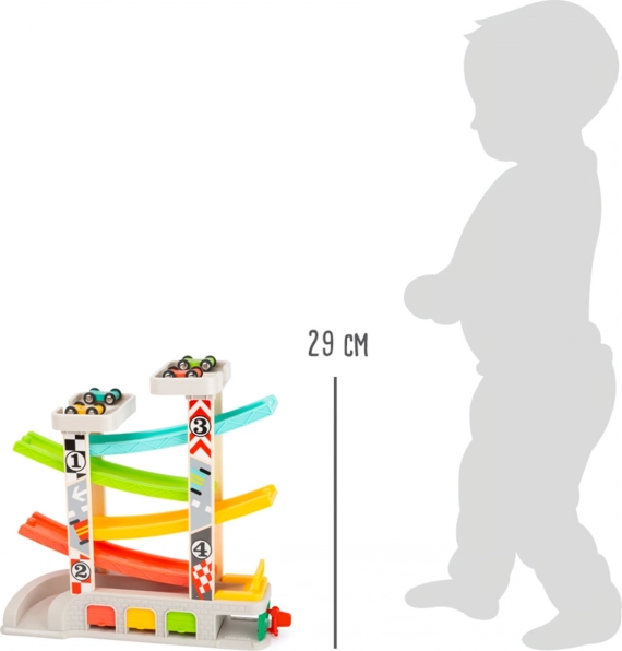 A versenypálya különböző szinteket és színes kisautókat tartalmaz, ami biztosítja a szórakoztató és oktatási játékélményt.