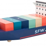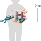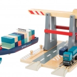 Ez az átgondolt kikötői építőkészlet valósághű logisztikai játékot kínál: a hajó két vontatóval kész a kifutásra, miközben a daru a beépített mágneseknek köszönhetően átrakja a színes konténereket. A masszív fa elemek és a finoman működő funkciók támogatják a finommotorikát, a fantáziát és a türelmet.