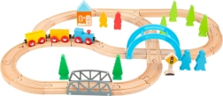 A készlet tartalmaz mozdonyt vagonokkal, hidat, házikót, fákat, figurákat és közlekedési elemeket a valósághű jelenetekhez. A természetes fa és az élénk színek kombinációja vonzó megjelenést ad és támogatja az érzékelést. Más fa rendszerekkel való kompatibilitása révén a gyerekek könnyen bővíthetik a sínvilágot.