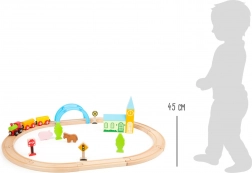 Varázsoljon vasúti idillt a gyerekszobába! Ez a minőségi SMALL FOOT fa vonatpálya gyorsan összerakható, stabilan tart, és az átgondolt kiegészítőknek köszönhetően megszámlálhatatlan történetet kínál – a nyugodt vidéktől a nyüzsgő városig. A vonat áthalad a kék hídon, elhalad fák, állatok és közlekedési táblák mellett, és minden út során megmozgatja a fantáziát.