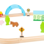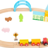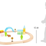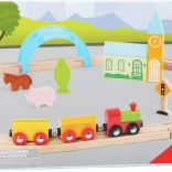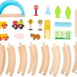 A szett 24 elemet tartalmaz, köztük mágneses kisvonatot vagonokkal, összepattintható fa síneket és színes díszítőelemeket. A tartós fa kivitel kellemes tapintású, biztonságos és ideális a kis kezek számára. A játék természetes módon fejleszti a finommotorikát, a kéz–szem koordinációt és segít a közlekedési szabályok elsajátításában.