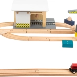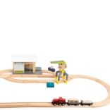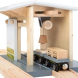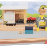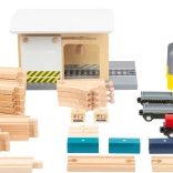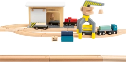 Fedezze fel a komplett fa vasúti készletet, amely teljes mértékben kompatibilis a megszokott favonat-pályarendszerekkel. A gyerekek valósághű rakodást élhetnek át a daruval, áruszállítást és játékot a depóban. A készlet akár 44 elemet tartalmaz, köztük 25 sínt, 360°-ban forgatható darut, mágneses vagonokat és rakományokat, valamint csigás tolófalat. 100% FSC fából készült a biztonságos és fenntartható játékért.