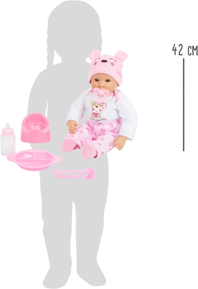 A gazdag kiegészítőcsomag cumit, üveget, tányért evőeszközökkel és bilit tartalmaz, harmonizáló színekben. A gyerekek gyakorolhatják az etetést, a pelenkázást és a higiénés szokásokat játékos szerepjáték formájában. A ruhák könnyű átöltöztetésre készültek, így a kisebb kezekkel is remekül kezelhetők.