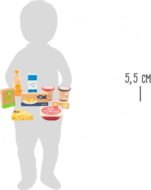 A szettben narancslé, két doboz fagylalt, borsó, halrudak, vaj, sajt, szeletelt felvágott és egy doboz tej található. A valósághű nyomatok és a természetes megjelenés első pillantásra magukkal ragadnak. A masszív fának köszönhetően a készlet tartós, és készen áll a mindennapos játékra.