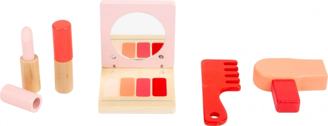 A fa készlet különféle eszközöket tartalmaz a szépségápoláshoz, amelyek inspirálják a gyerekeket kreatív játékra és fejlesztik képességeiket.