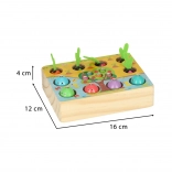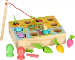 Vidd el a gyermeket a tópartra és a kertbe – anélkül, hogy kilépnétek otthonról. A tömörfa játékalap nyílásokat rejt a halacskáknak, gilisztáknak és színes répácskáknak. A gyerekek mágneses horgászbottal fogják ki őket, vagy filc leveleknél fogva húzzák ki, így természetes módon gyakorolják a fogást és az ujjak finom érzetét.