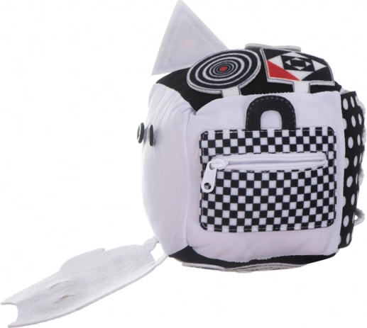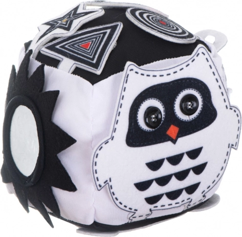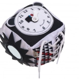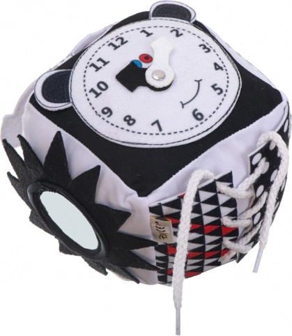 Ez a puha szenzoros kocka minden nap különlegessé teszi a kis felfedezők számára. Kontrasztos mintái és fekete-fehér színei stimulálják a látást, miközben a különböző textúrák segítenek a tapintás fejlesztésében. A kocka csörgővel és zizegő elemekkel van felszerelve, amelyek a legkisebbek hallását is felkeltik.