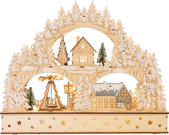 Kézműves hatás, precízen kivágott fák és házikók, valamint a fa természetes árnyalata teszik az ívet a karácsonyi dekoráció figyelemfelkeltő középpontjává az ablakban és a komódon egyaránt.