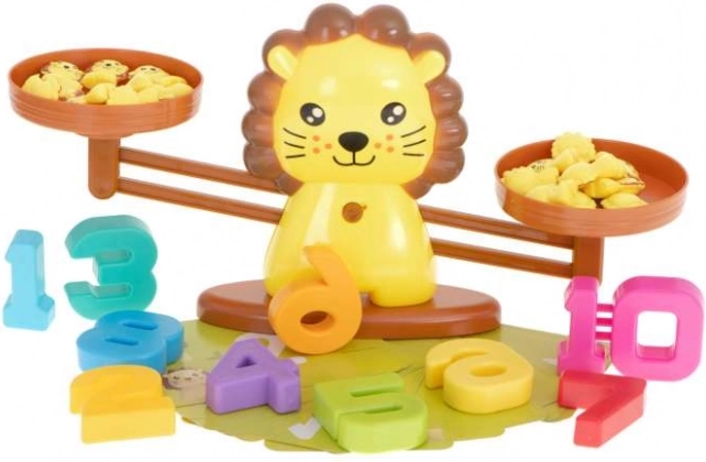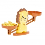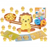 - Oroszlán formájú mérleg, 19 kis oroszlánkölyök, 1–10 számjegyek, 30 matematikai feladatkártya
