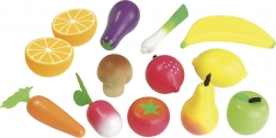 A dobozban található: répa, citrom, retek, póréhagyma, padlizsán, csiperkegomba, paradicsom, banán, alma, körte, eper és egy narancs két fele. A gyerekek játékosan gyakorolhatják a színeket, a formákat és az élelmiszerek szerinti válogatást.
