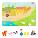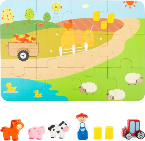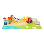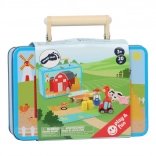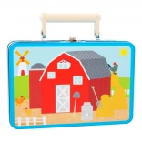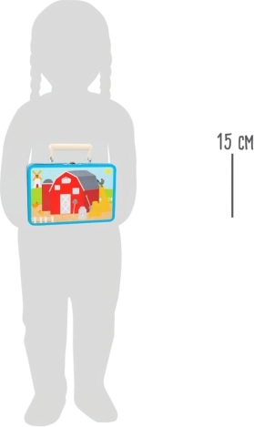 A malac röfög, a traktor dübörög. Hordozható játék gyönyörű bőröndben: a gyerekek a fa traktor, háziállatok és a farmer figuráinak köszönhetően megalkothatják saját farmjukat. Először rakjátok ki a puzzle alapját, és már kezdődhet is a játék! A farmot a szénabála figurák teszik teljessé. Merülj el a vidéki életben, és engedd szabadjára a fantáziádat. A bőrönd masszív fémből készült, a fogantyú fából van, a zár könnyen nyitható. Ideális gyerekszobába, játszószobába... Főbb jellemzők: 12 db puzzle-t és egy farmert, traktort, malacot, tehenet, lovacskát és szénabálákat tartalmaz; praktikus csomagolás – fém bőrönd fa fogantyúval