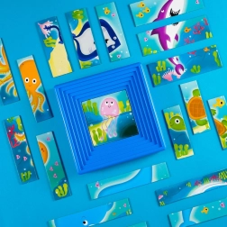 A CAROTINA Baby progresszív puzzle örömteli ismerkedést kínál a kirakózással már a kezdetektől. A 8 kirakó mindegyike eltérő darabszámú, a nehézség fokozatosan nő, így a gyermek természetes módon fejlődik frusztráció nélkül. A tengeri világot bemutató tematikus képek játékra és felfedezésre ösztönöznek.