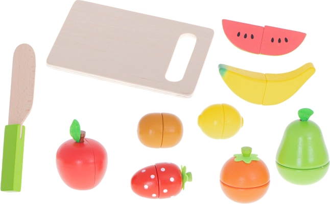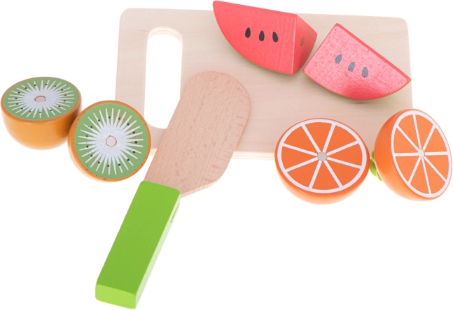 A gyümölcsöket több részre vághatja a készlethez tartozó biztonságos késsel. Helyezd őket a deszkára és szeleteld fel.