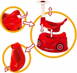 A piros kisautó valósághű megjelenése kormánnyal és „kerekekkel” játékká teszi a bilire szoktatást. A gyermek a bilizést örömmel és kíváncsisággal köti össze.
