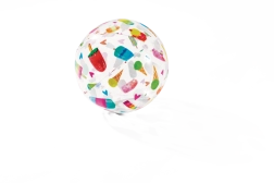Az átlátszó labdát színes gyümölcs-, fagylalt-, halacska- és tengeri motívumok díszítik. A minta véletlenszerűen kerül kiválasztásra, de mindig vidám megjelenést és jó láthatóságot biztosít vízben és a parton is.