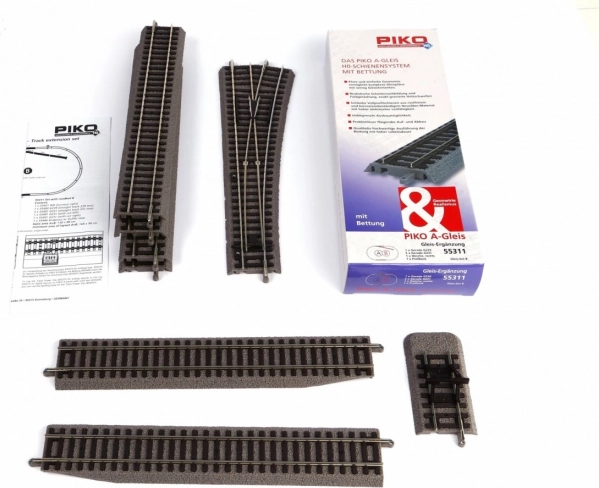 Teljes PIKO vasúti készlet H0 méretarányhoz, élethű ágyazattal és valósághű talpfaszövetettel. Két egyenes pályaszakaszt és egy egyszerű kitérőt csonkavágányra tartalmaz, amely kézzel működtethető. Ideális az ovál bővítéséhez – már csak íves sínekre és egy tápcsatlakozós egyenes sínre van szükség. A minőségi ágyazat stabilitást és csendes futást biztosít.