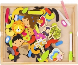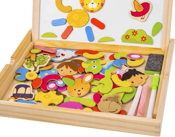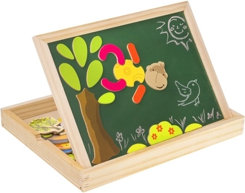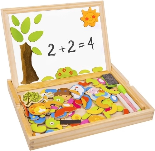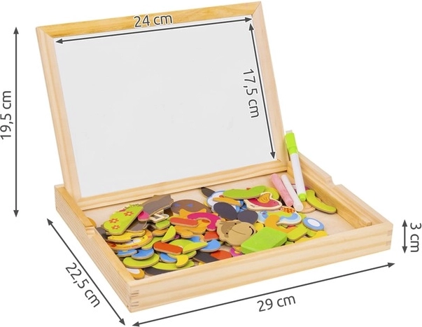 Hozzon gyermekeinek órákig tartó szórakozást és kreatív tanulást ezzel a fa mágneses táblával! A tábla két oldallal rendelkezik: fekete krétával való rajzoláshoz és fehér tollal való íráshoz vagy mágneses képek elrendezéséhez. A példákat tartalmazó füzet segítségével a gyerekek különféle mintákat és motívumokat hozhatnak létre.