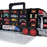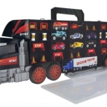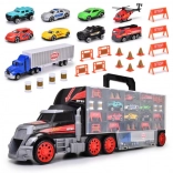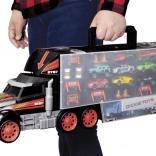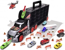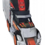 Az óriás teherautó-bőrönd egyesíti a tárolódobozt és a játékszettet. A nyitható rekeszek elfértetik a teljes jármű- és kiegészítő készletet, a praktikus fogantyú pedig megkönnyíti a hordozást. A fülkében található kézi indító mechanika versenypályává változtatja a teherautót, és akciódús rajtokról gondoskodik.