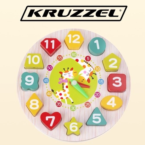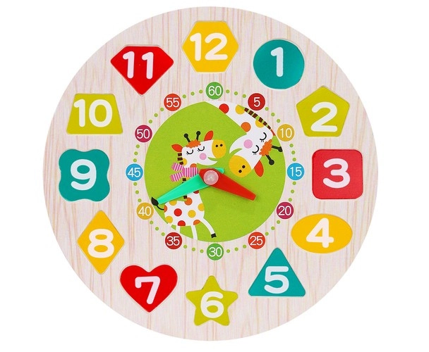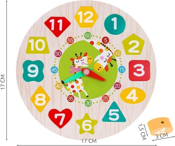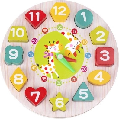 Ez a fából készült oktató játék egyesíti a játékot és a tanulást. A kerek alaplapon az 1–12-ig terjedő számok különböző alakokban segítik a gyerekeket az alakok párosításában, a színek és számjegyek megismerésében, miközben a mozgatható óra- és percmutató támogatja a teljes órák és percek megértését. A tartós faelemek kellemes tapintásúak és biztonságosan megmunkáltak.