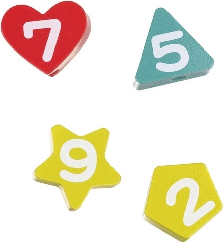 A készlethez tartozik egy zsinór fa fogantyúval. A számok felfűzése türelemre, koncentrációra és az ujjak ügyességére tanít.